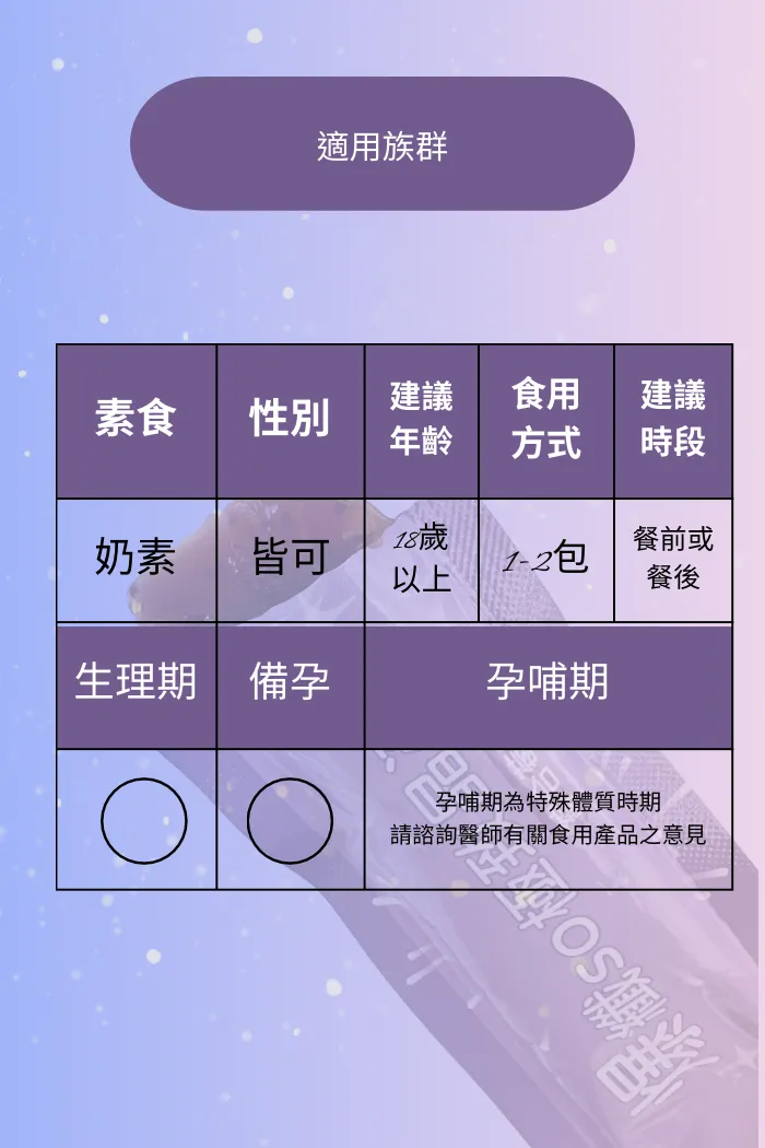 建議食用方式:每日1-2包,餐前、後均可,食用後請搭配足量開水