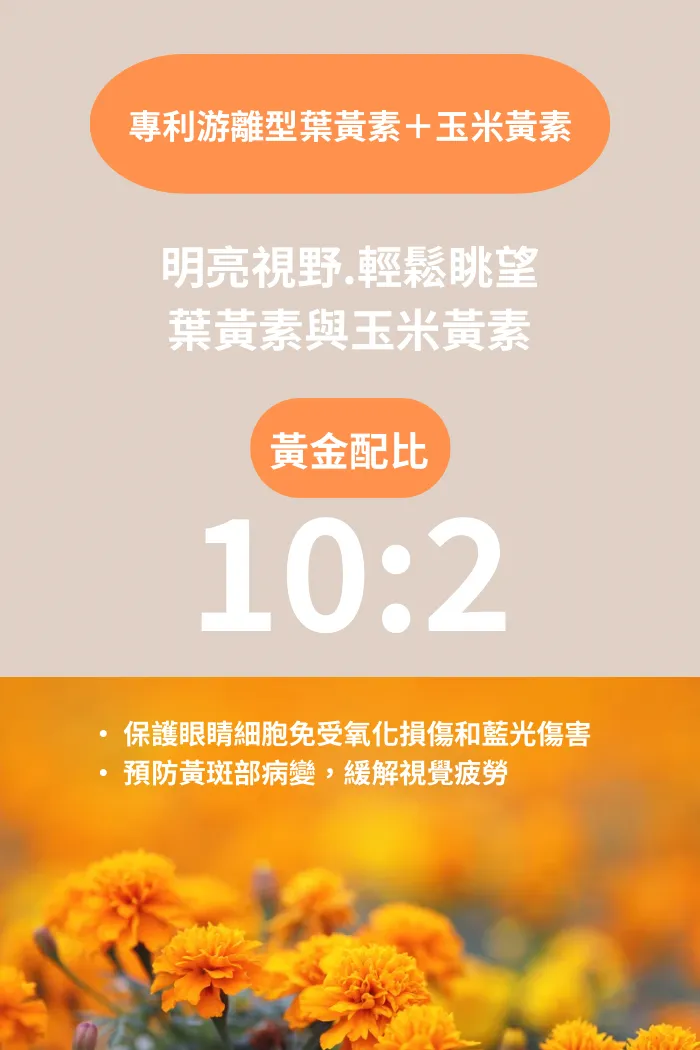 游離型葉黃素結構與分子量更小,因此吸收效果也更佳一天一條-二條10:2黃金比例,
