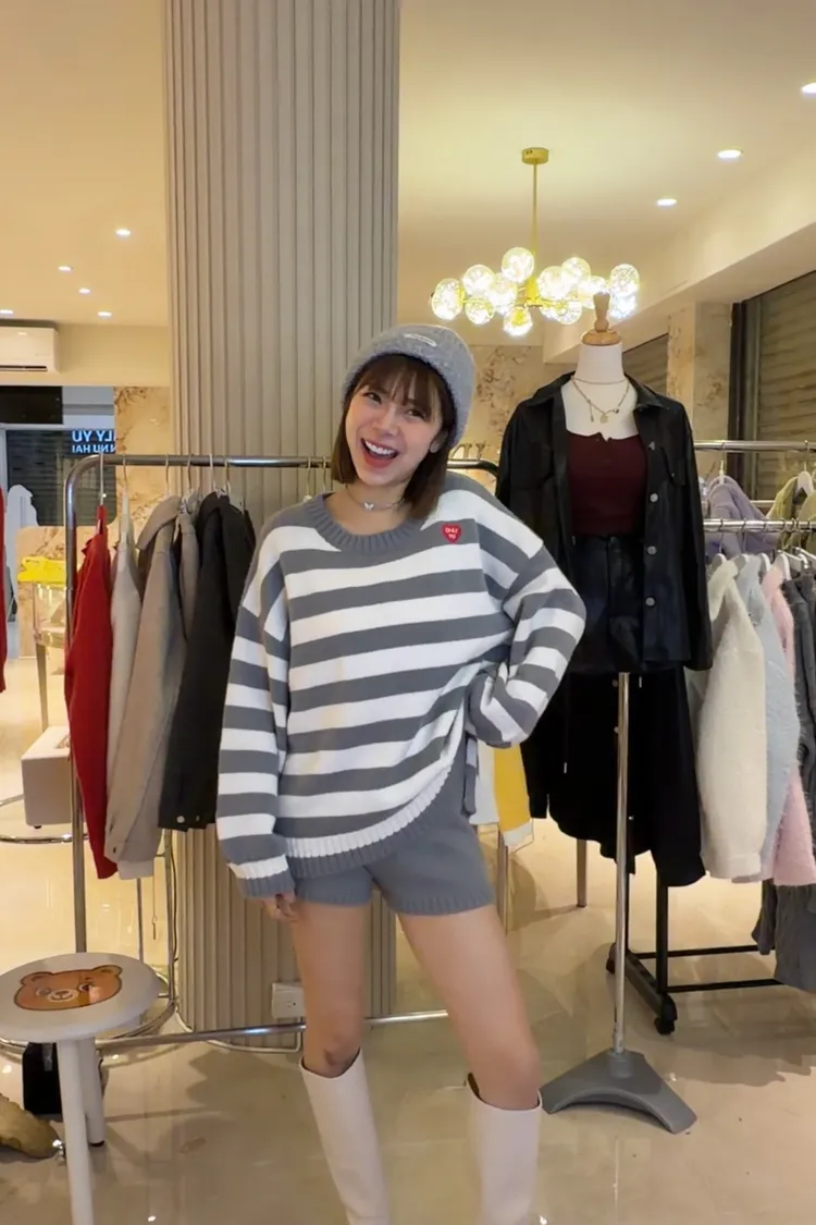 🤍 愛心電繡橫條紋針織套裝(黑 / 灰)
