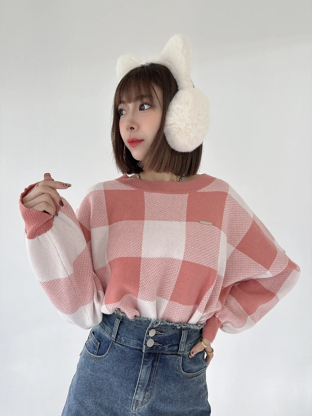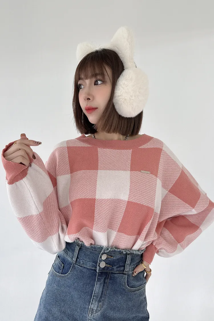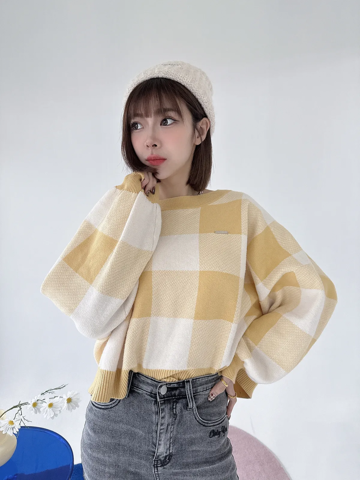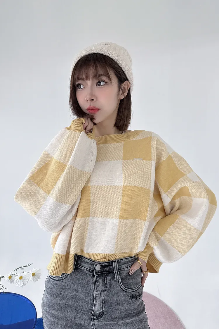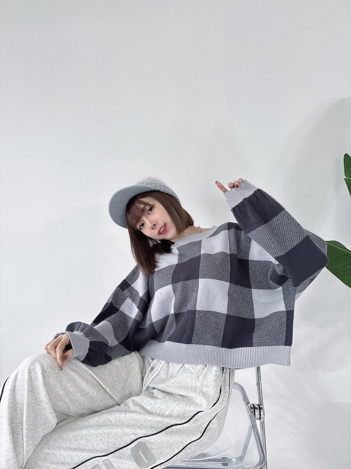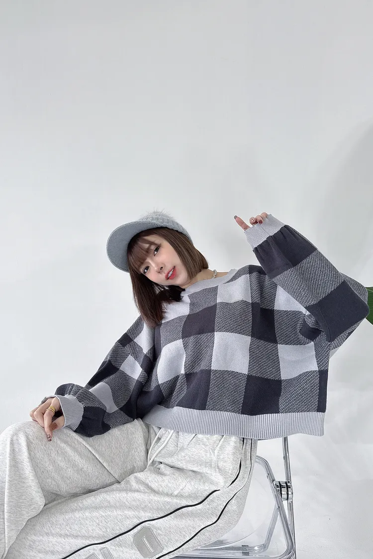 這件是 版型寬、但完全不顯胖 的那種格紋針織